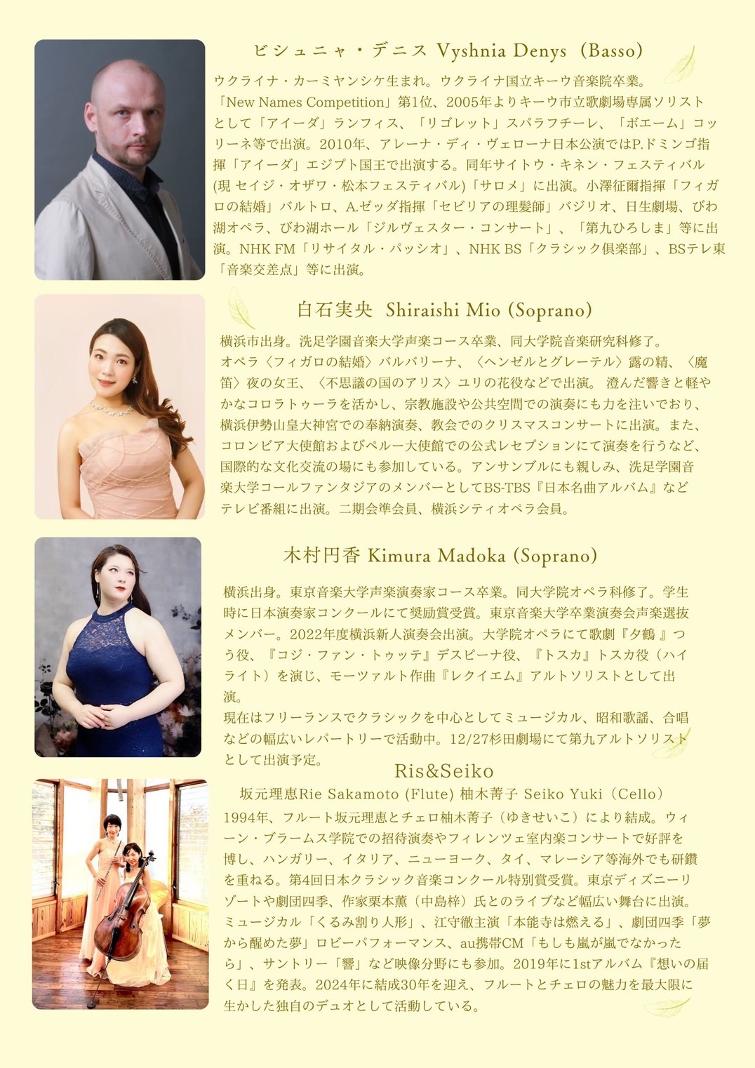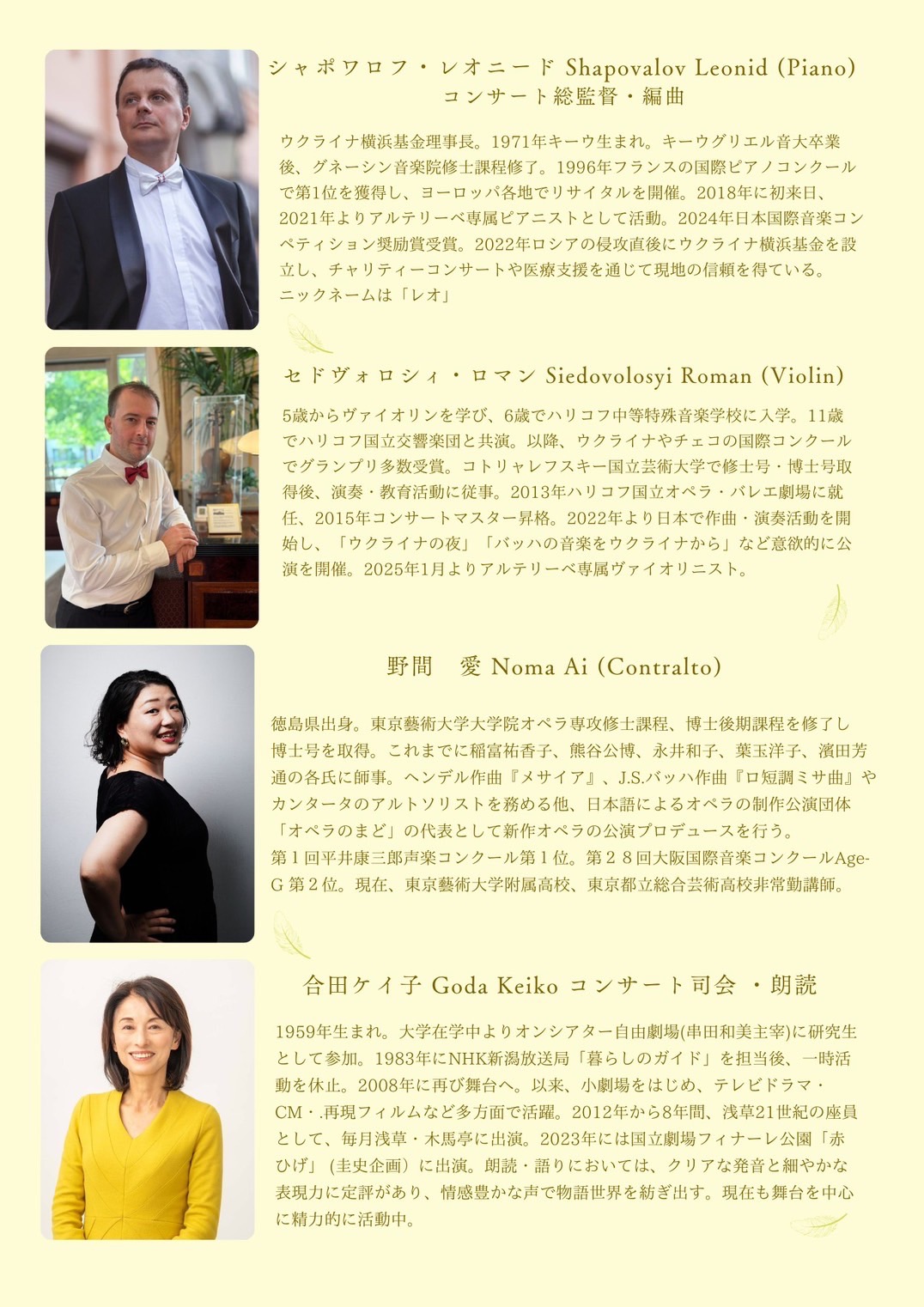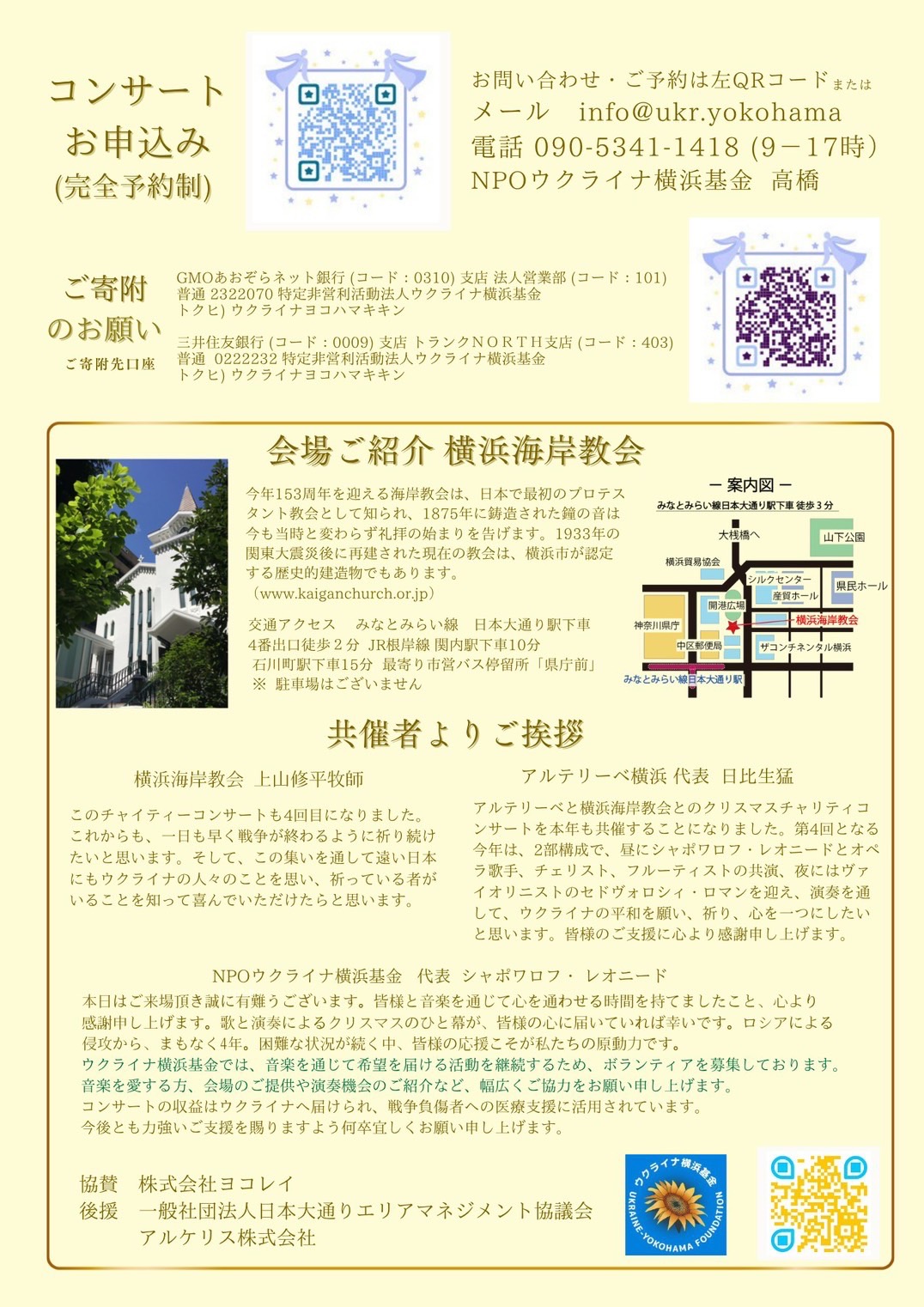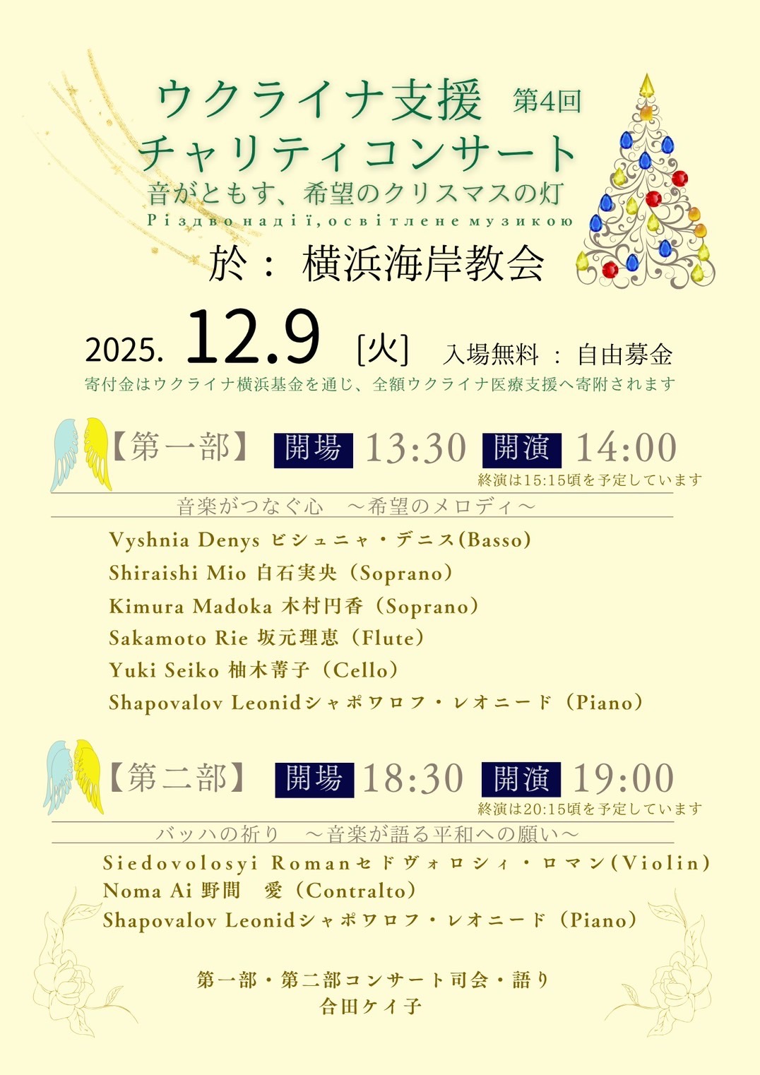 アルテリーベと横浜海岸教会とのクリスマスチャリティコンサートを本年も共催することになりました。第4回となる今年は、2部構成で、昼にレオニド・シャポワロフとオペラ歌手、チェリスト、フルーティストの共演、夜にはヴァイオリニストのロマン・シエドヴォロシを迎え、演奏を通して、ウクライナの平和を願い、祈り、心を一つにしたいと思います。皆様のご支援に心より感謝申し上げます。